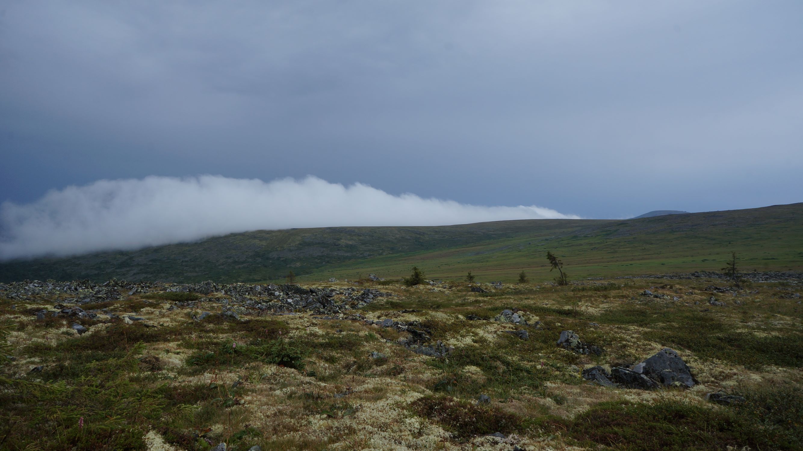 Итак, Шмыга уехала, Почти следом за ней проехали квадры и багги, обогнавшие нас вчера, и теперь возвращающиеся с Отортена. И вот мы остались одни. Место, где мы остановились – перевал, продуваемый всеми ветрами, покрытый тундровой растительностью, где-то сбоку внизу шумит ручей. После грозы, ветер гонял облака то в одну сторону, то в другую, они цеплялись за верхушки гор и скатывались по склонам. Стоишь и смотришь, как как тебя, как лавина надвигается белое облако, и через минуту ты уже в белом молоке…