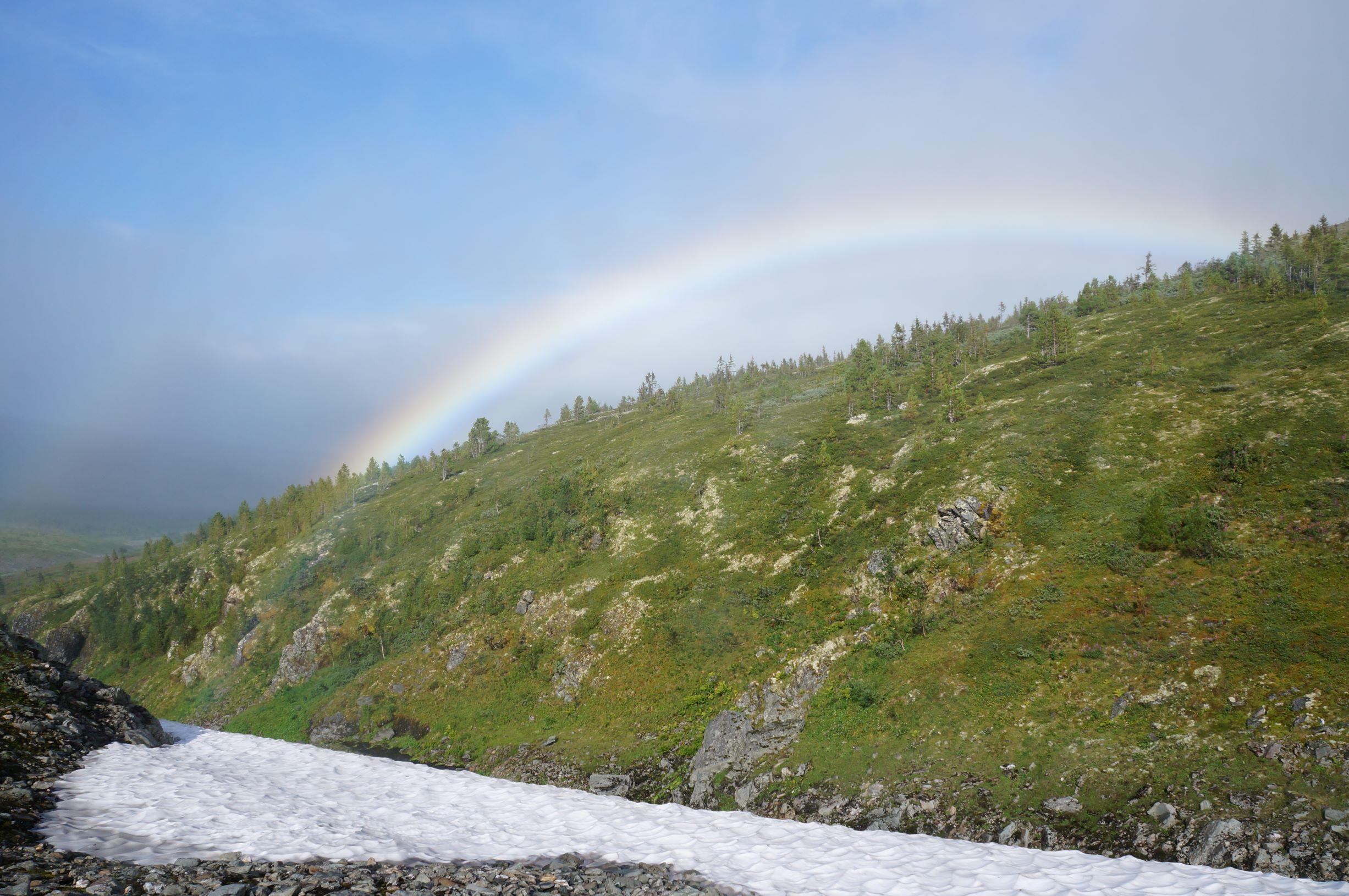 После обеда я отправилась смотреть на ручей с водопадами, стараясь на этот раз запоминать дорогу. Видимость была всего несколько метров и шел дождь. Но стоило спустится вниз, к ручью, как стало понятно, что на соседней горе периодически светит солнышко. Ручей и вправду был красив, на противоположном берегу был скальный выступ, над которым висела радуга. А вдоль северного склона, на который практически не попадает солнце, тянулся снежник. Зависнув там на несколько часов, вернулась в лагерь уже вечером, причем вышла на нужную точку четко в лоб, чего только с перепугу не научишься делать. Навигатор и компас так и не понадобились…