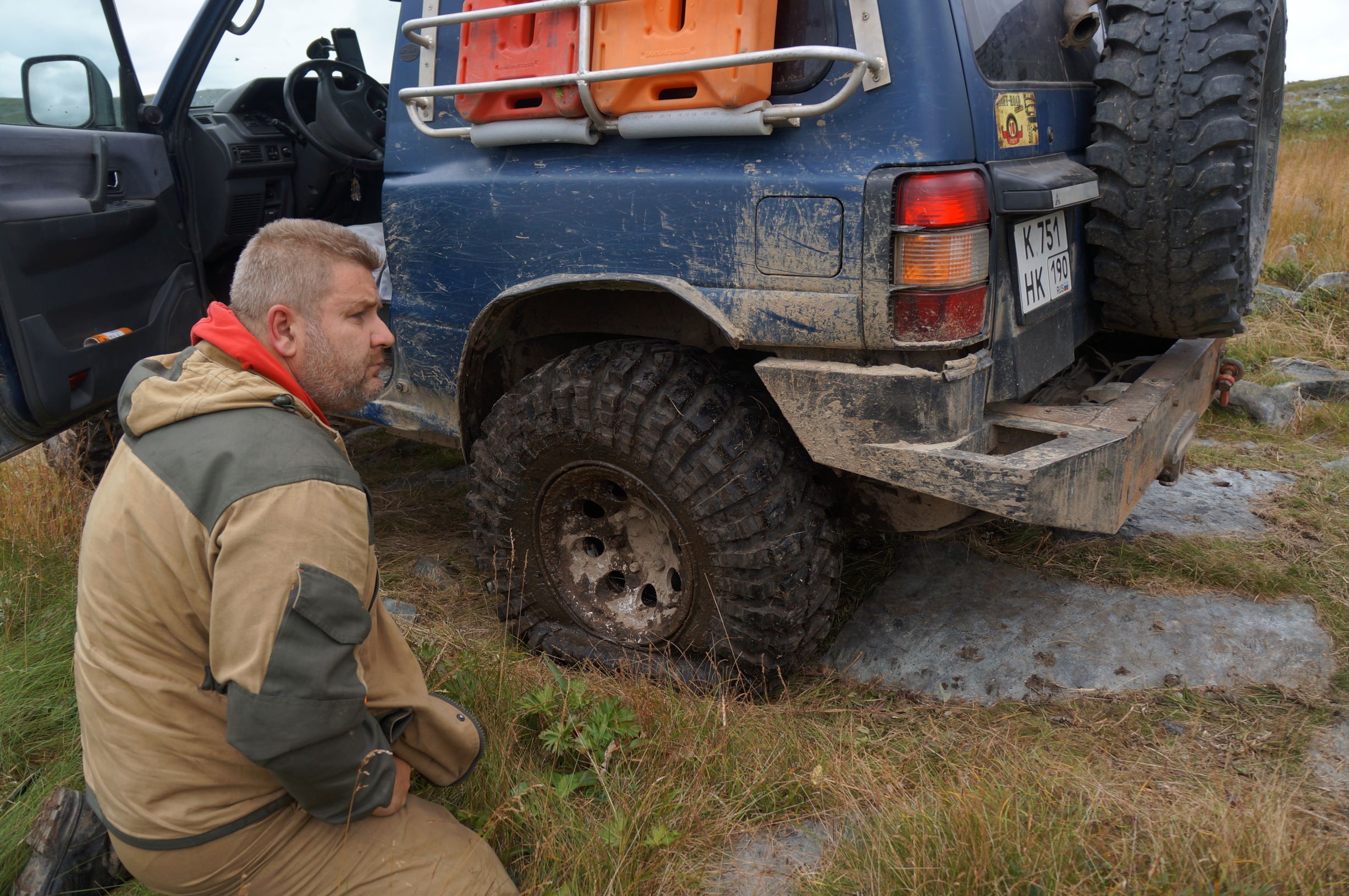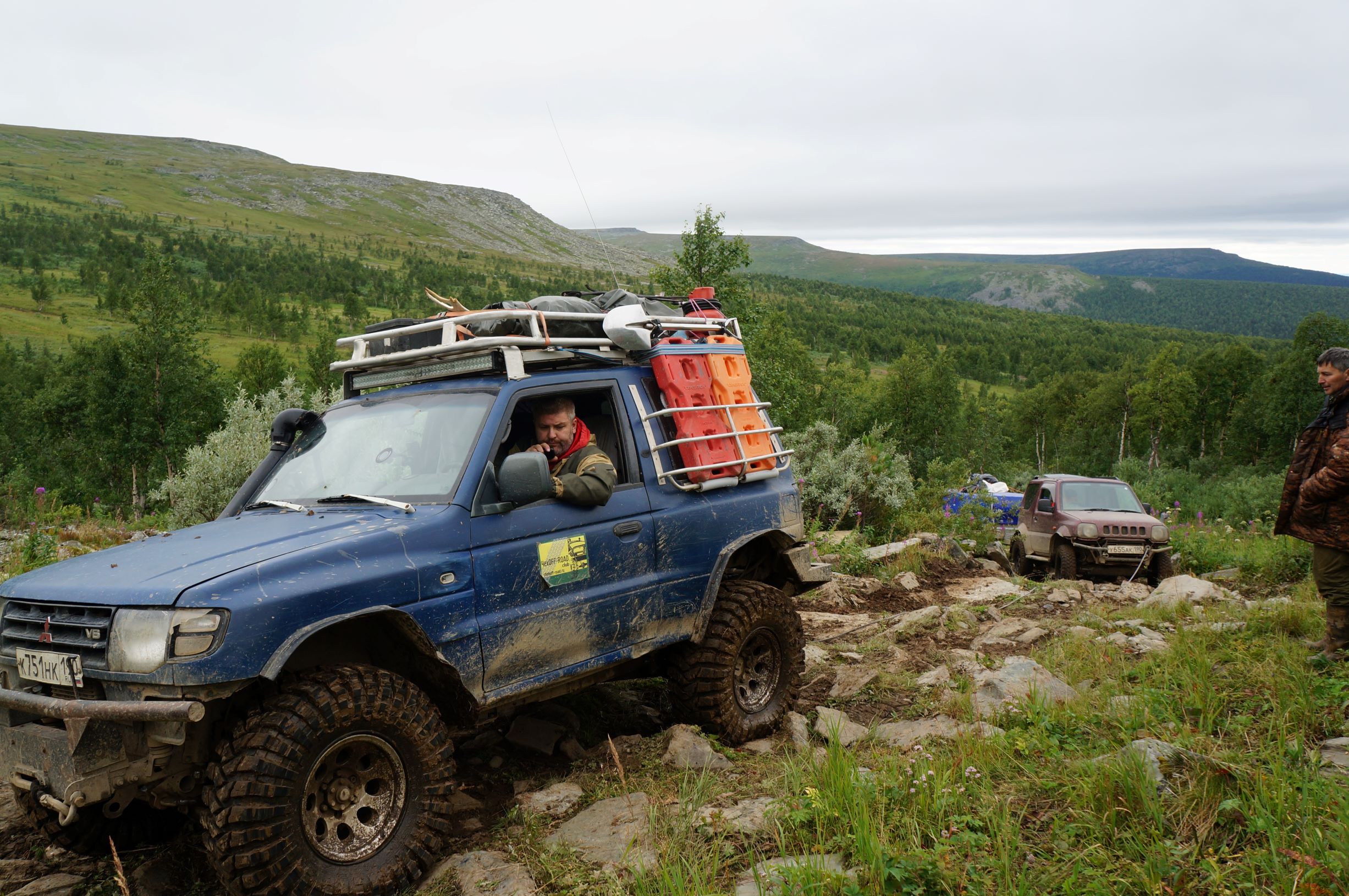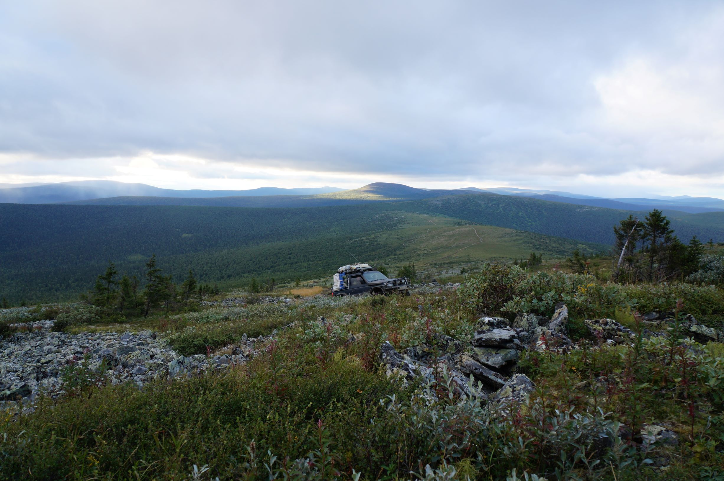 Распрощавшись, поехали дальше. Дорога шла по склону горы, и крен, вызванный рельефом, усугублялся полными бензина канистрами в боковых корзинах. Глядя вниз, и прикидывая предположительную траекторию полета машины, в случае падения, становилось не по себе. Ситуацию подогревала карта, с отметками мест, где уже кто-то когда-то переворачивался… Опыт езды по горам и курумникам у нас совсем небольшой, поэтому было страшновато. Но постепенно, волей-неволей мы привыкали к новому для нас стилю езды. Все понимали, что главное не торопиться и беречь машины. Накрапывающий дождик делал камни скользкими и добавлял остроты ощущений. Верхушки гор кутались в облака, где-то справа остался Отортен.