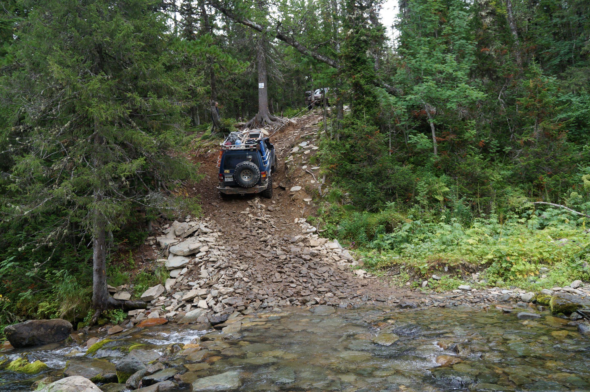 Подъем, спуск, ручей, и вот, долгожданная стена… Столько про нее рассказов и видюшек. Да, стена уже не та. За последние годы столько народу проехало по ней, столько колес копало землю и вырывало камни, столько лебедок, частенько без корозащиток, цеплялось за ближайшие стволы… дорога прокопана и затем промыта водными потоками почти на метр, но, все равно это еще внушительный подъем, взобраться на который не так-то просто, особенно тяжелым машинам.