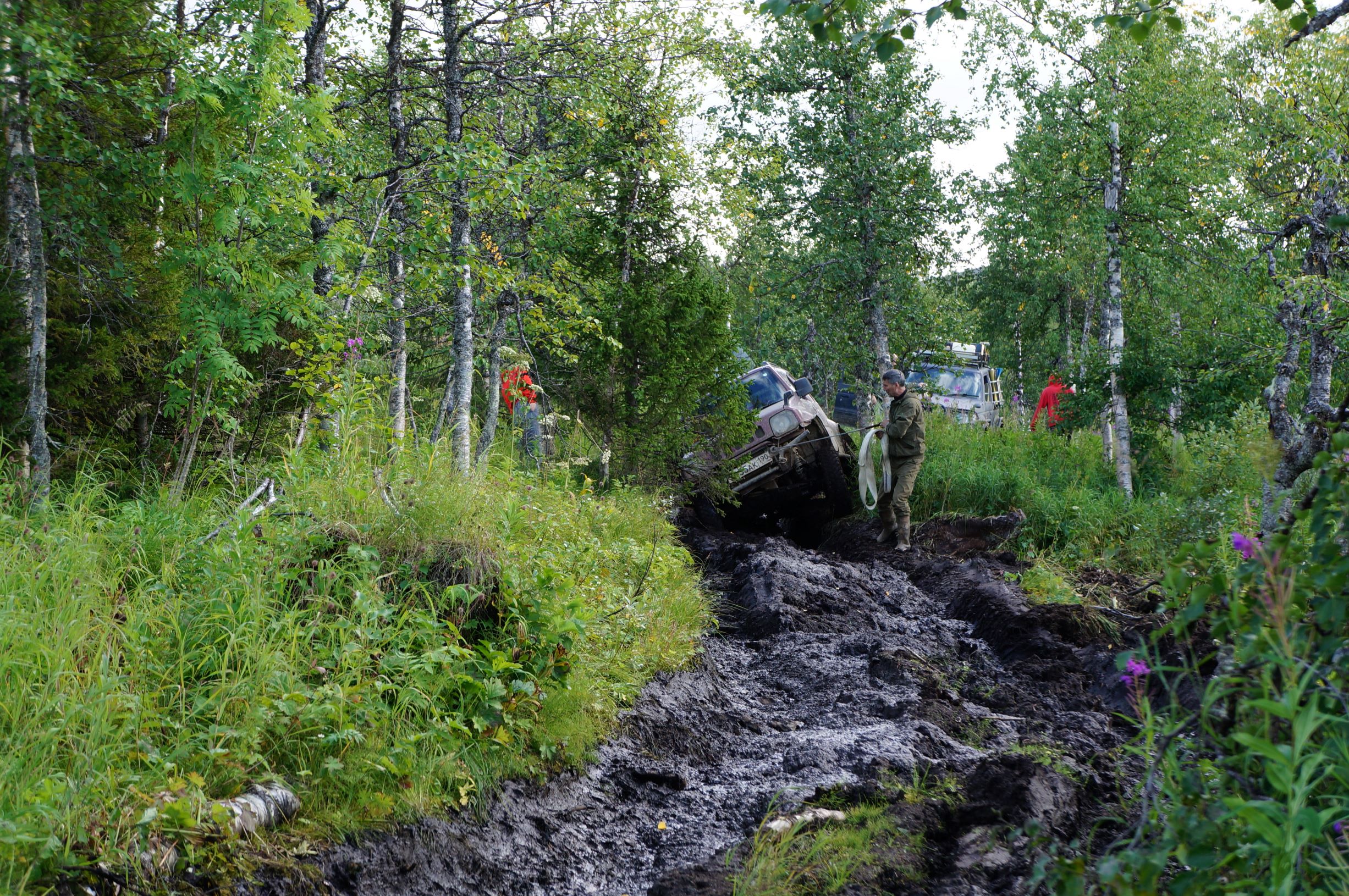 Шмыга въезжает сама легко и красиво. Разворачивается, упирается передним бампером в дерево и готовится тащить остальных.