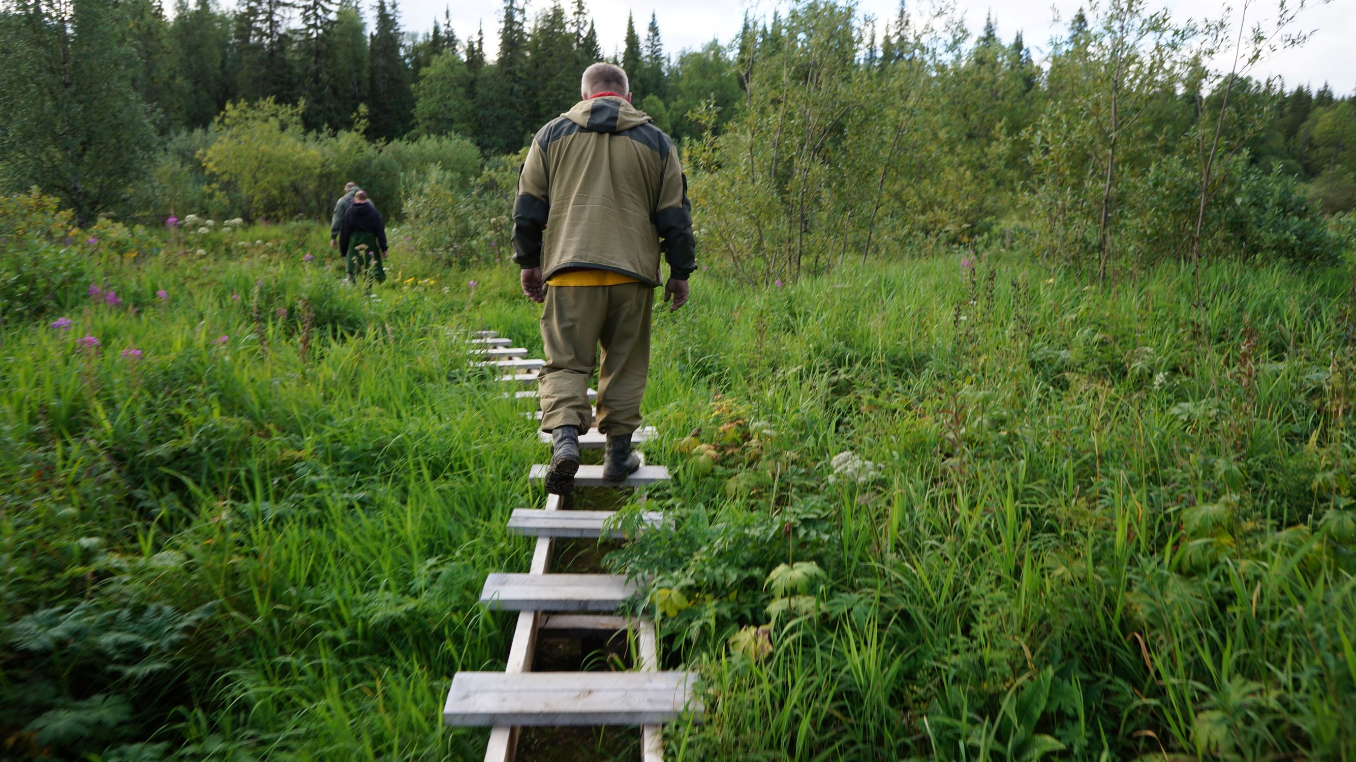 Дорога обратно… Это трэш… Ходьба по ночному лесу с одним фонариком на двоих, периодическими похлопываниями для отпугивания медведей и постоянными напоминаниями от проводника, что нужно громче говорить. Говорить мы не могли… Еле переставляли ноги. На этот раз делали привалы, но после них было только хуже. Звезды кружились перед глазами, а ходьба по свежим доскам, белеющим в темноте, вообще походила на движение в тоннеле со стереоскопическим эффектом. Последние 800 м казались нескончаемыми. В добавок луна скрылась и начал накрапывать дождь. К машинам пришли во втором часу, под дождем поставили шатер и рухнули спать. Ужинать не стали.