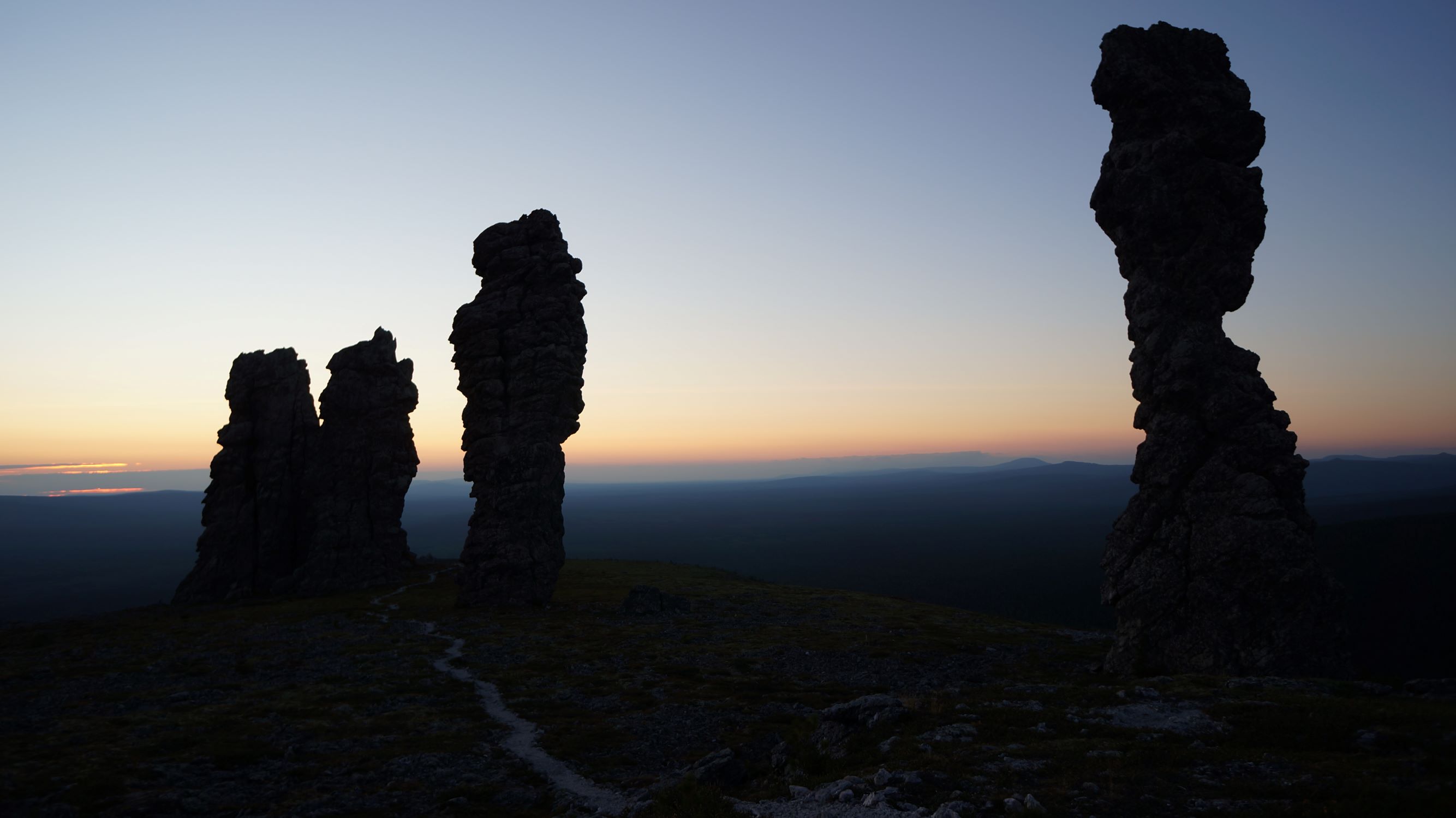 Тропа, отсыпанная щебенкой только на вершине горы, все остальное - обычная тропинка по лесу и курумникам. Но сейчас там строят странное сооружение, называемое мостом. На вбитые в землю металлические опоры делают дощатый настил на высоте примерно 60 см над землей. Доски кладут под шаг, что удобно, но, если ты оступился, прощай ноги. Перил тоже нет… Говорят, потом застелют сплошняком, а пока работают на метраж. Стоимость погонного метра называют заоблачную, даже писать не буду, с учетом того, что работают волонтеры бесплатно. Итак, дорогу на плато мы прошли более-менее легко и пришли точно к закату. В домике нас ждал проводник Паша. Он рассказал нам правила и повел к останцам. Во всех отчетах народ пишет про эмоции, охватывающие при виде них… Наверное, они бы у меня тоже были, если бы не усталость. Ну да, порадовались, по фоткали, но не того совершенно ждали.