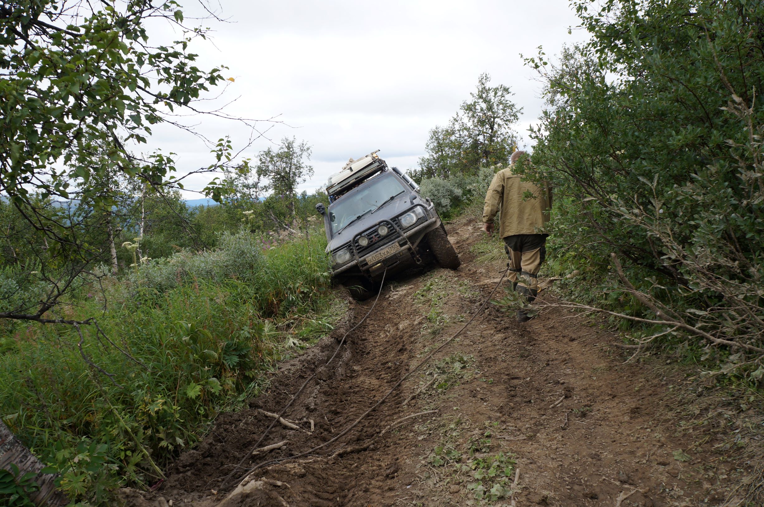 Следующий едет наш Паджерик. Он самый тяжелый и въезжает совсем недалеко. Дальше на лебедке.