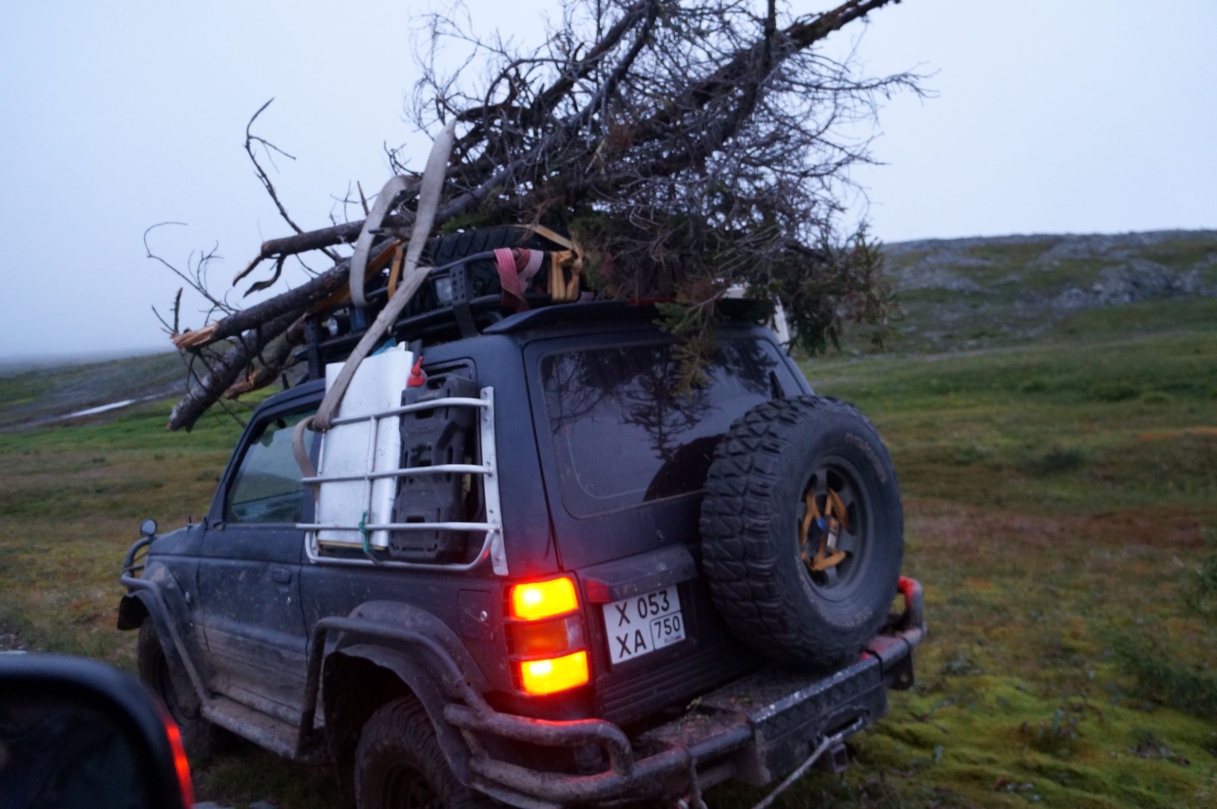 В итоге шесть километров превратились в девять с половиной, стемнело и пошел дождь. Правда мы еще потеряли время на то, чтобы собрать дрова. В результате Дракон стал похож на ведьмину метлу. Попытки тащить связку сзади машины показали, что так стремительно перетирается корозащитка, используемая для связки хвороста, что овчинка выделки не стоит.